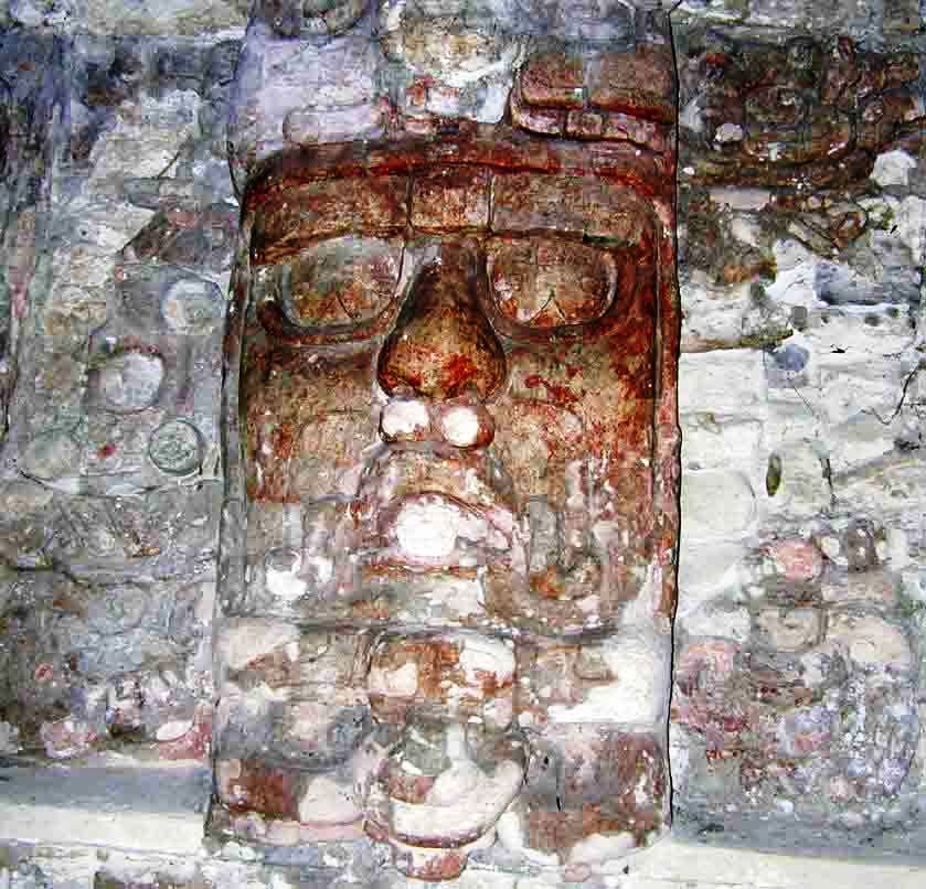 whose central stairway is flanked by huge humanized stucco masks. Built around